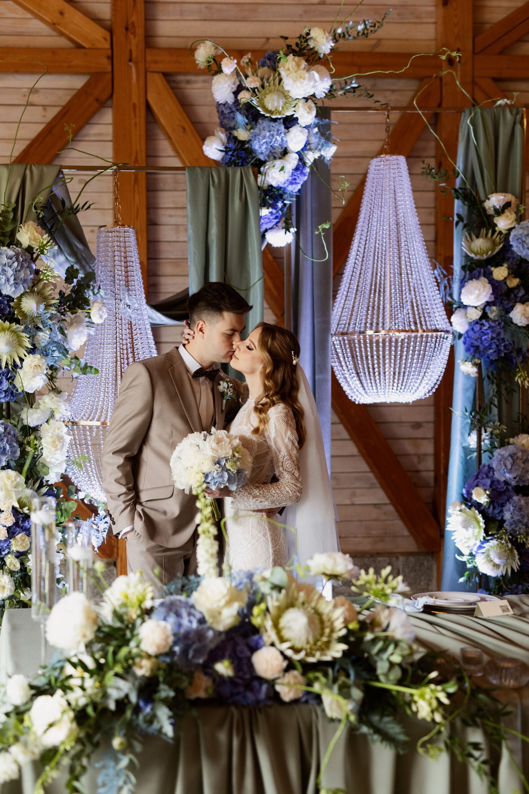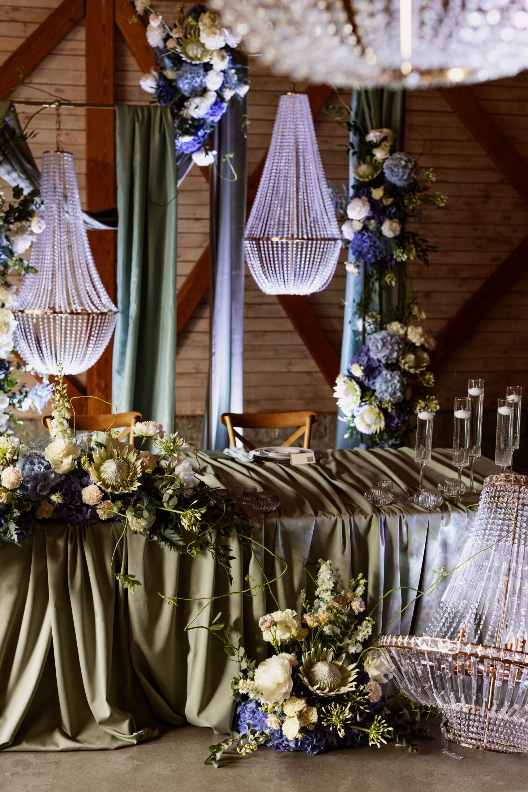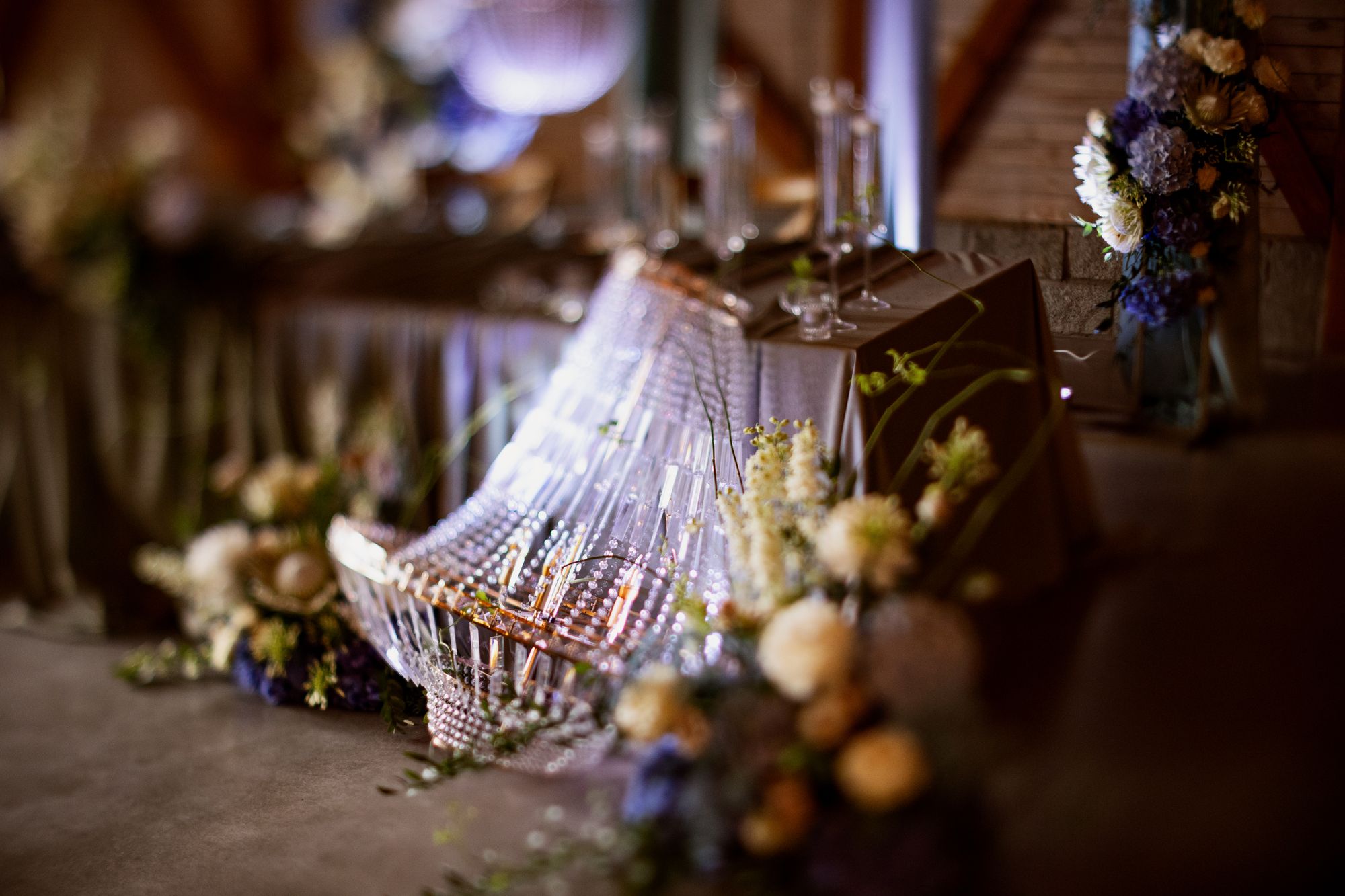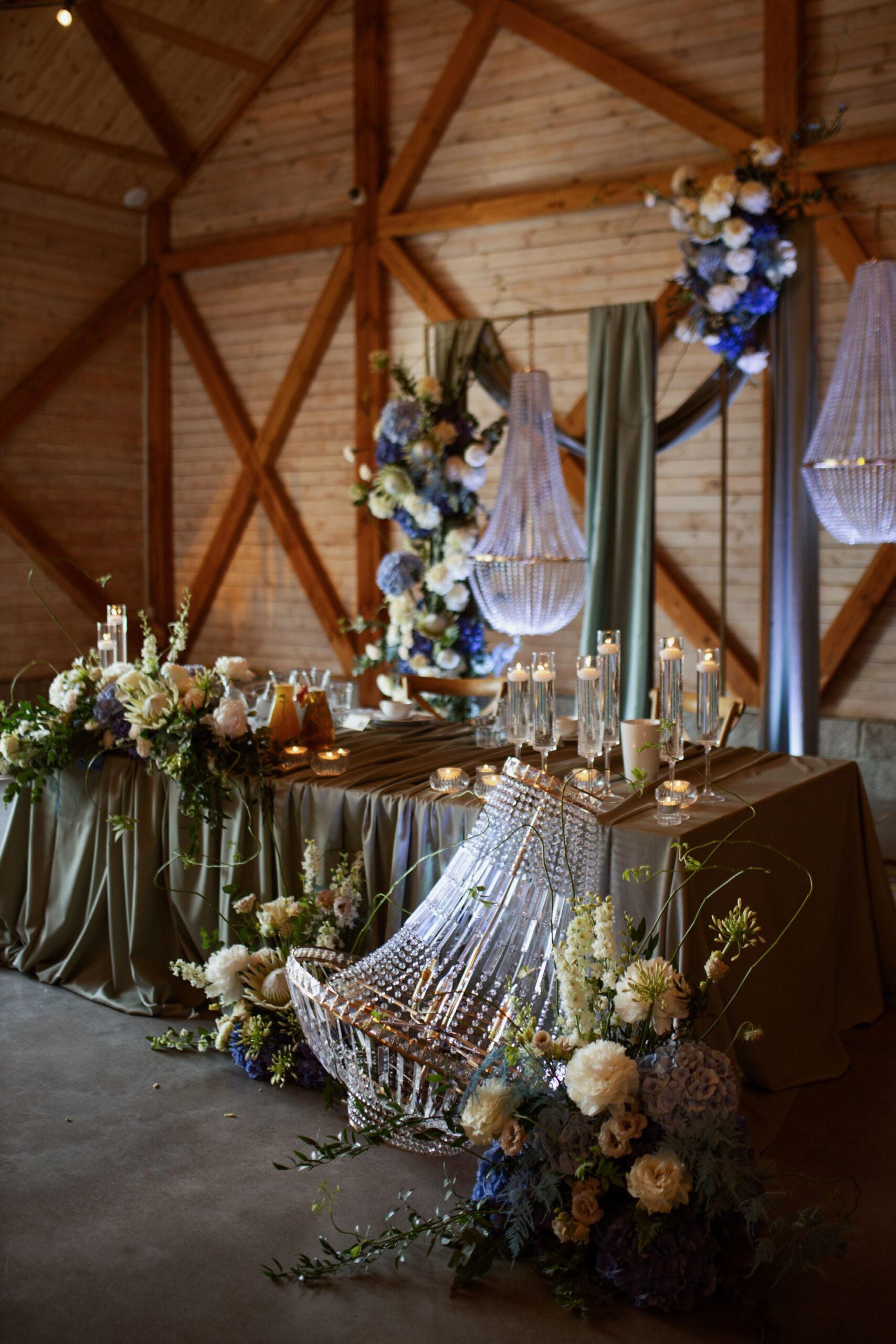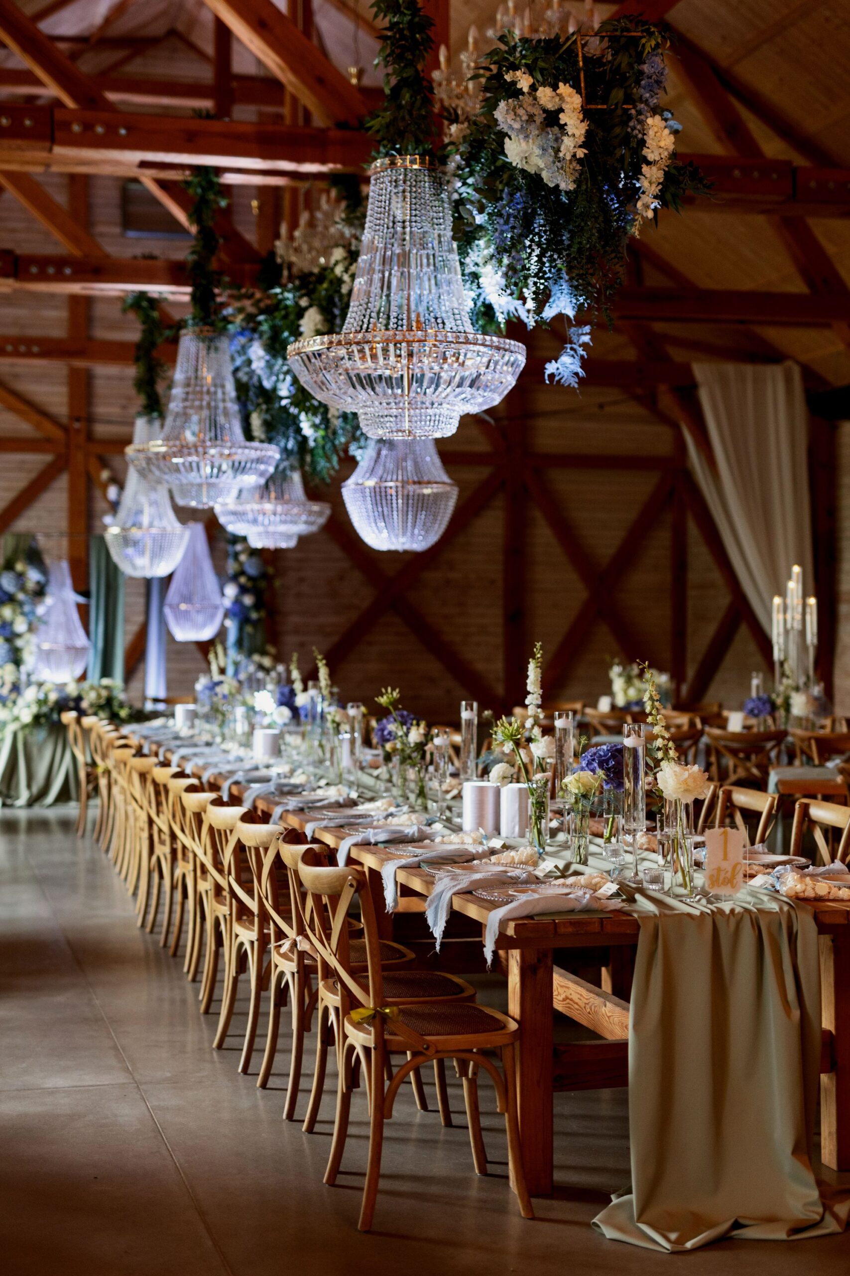 Centralnym punktem tej realizacji była ogromna, podłużna podwieszana kompozycja kwiatowa, zawieszona nad stołami gości. . Wśród kwiatów zawisły podwieszane żyrandole, które dodały dekoracji klasy i subtelnego blasku, jednocześnie budując wyjątkową atmosferę przyjęcia weselnego.