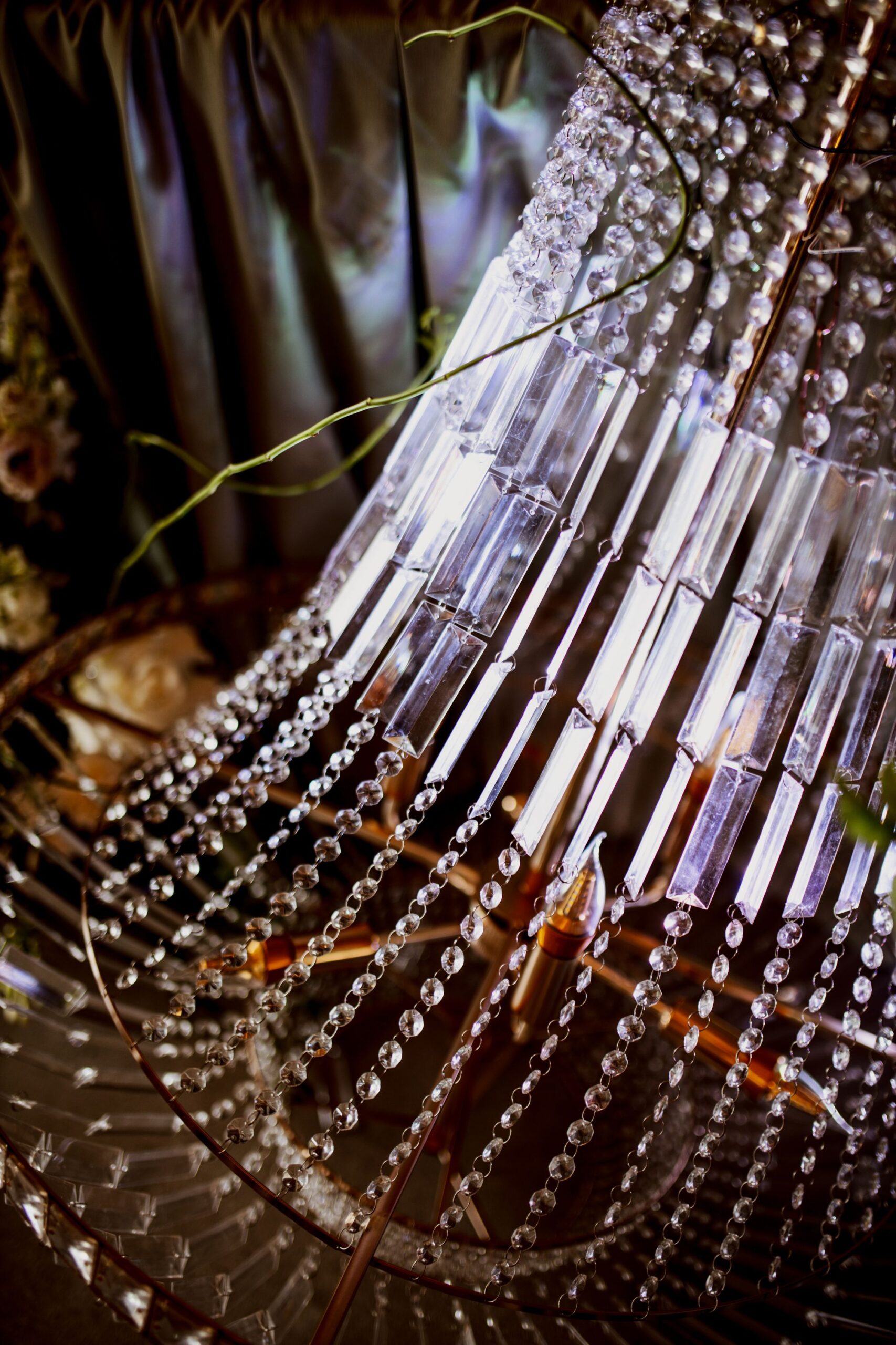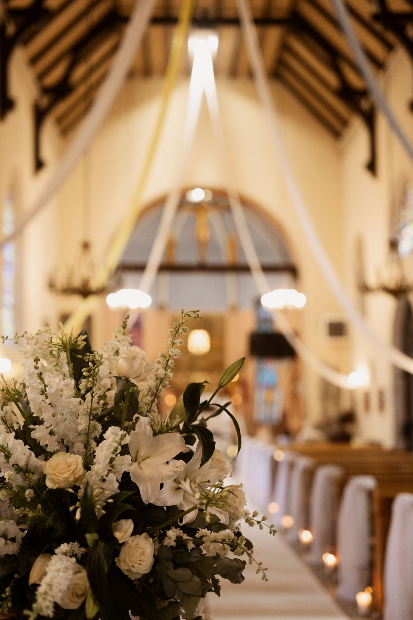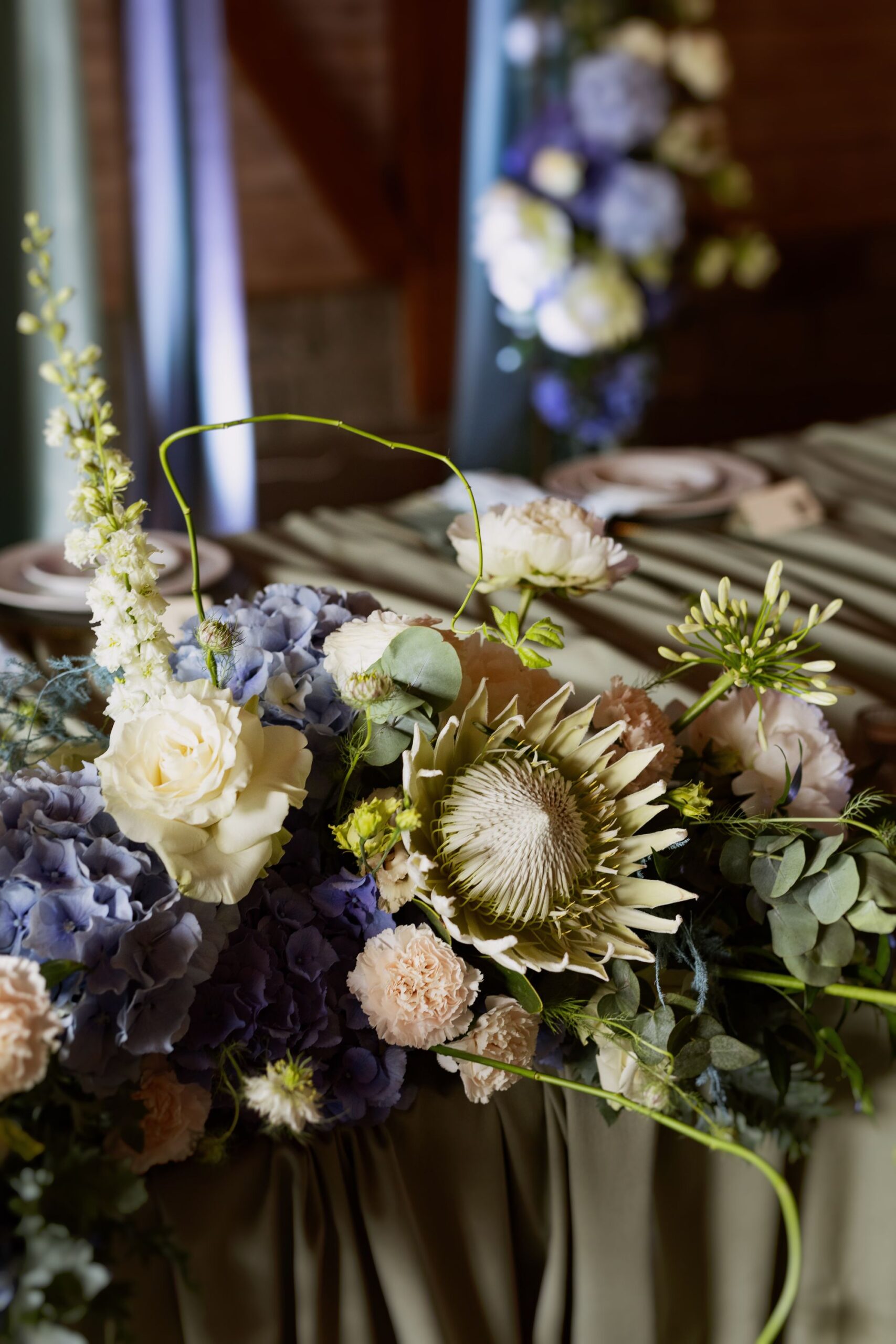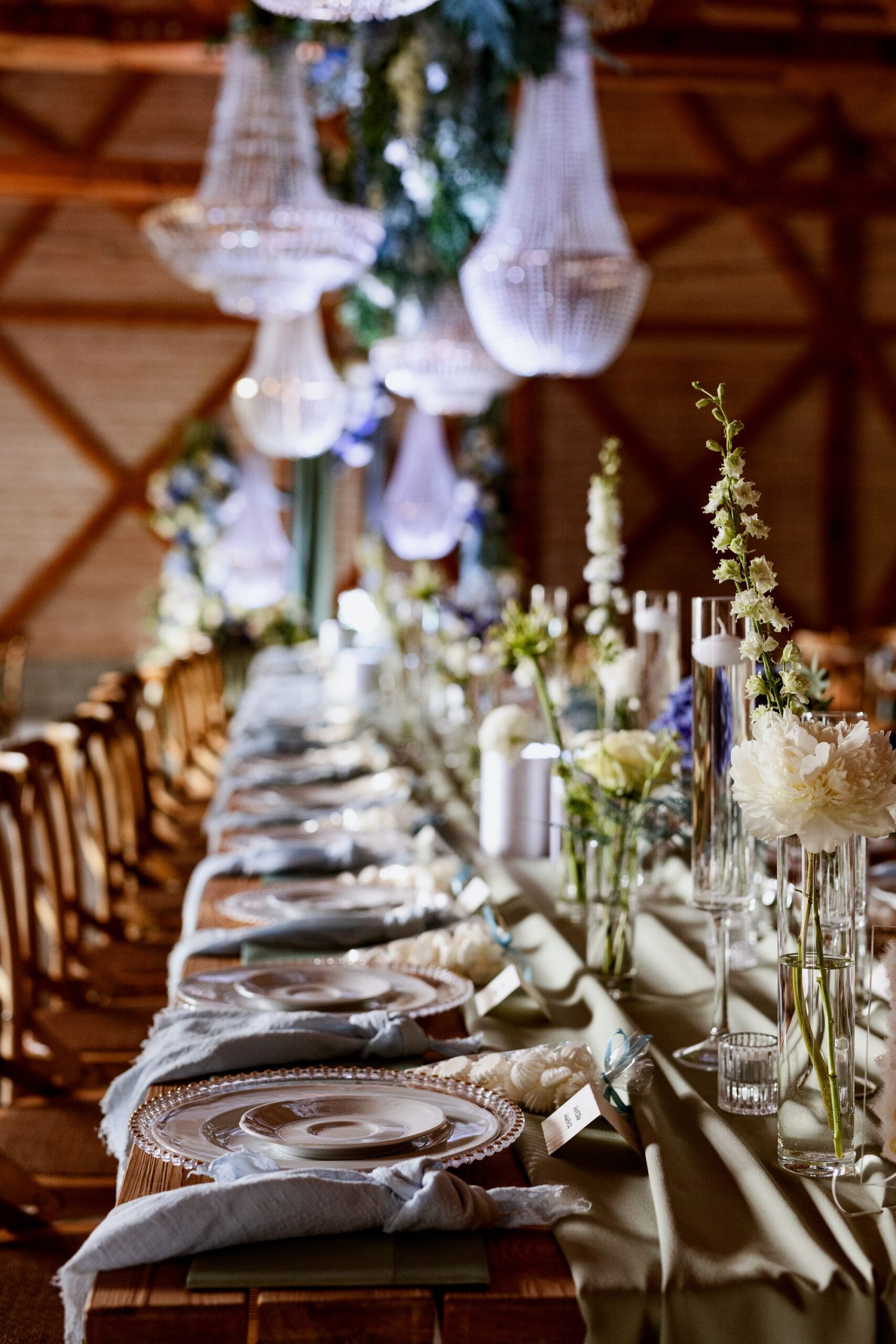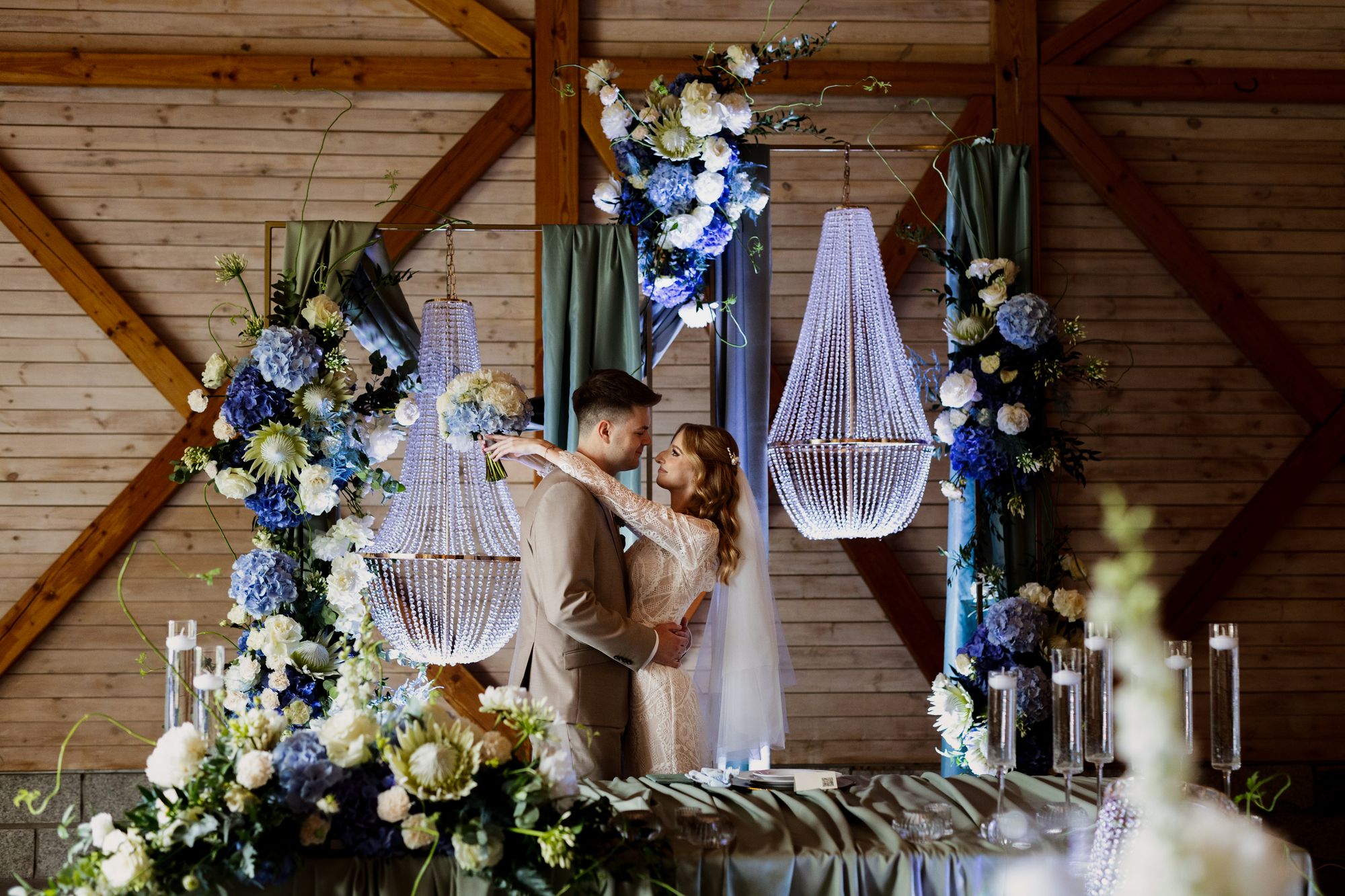 Centralnym punktem tej realizacji była ogromna, podłużna podwieszana kompozycja kwiatowa, zawieszona nad stołami gości. . Wśród kwiatów zawisły podwieszane żyrandole, które dodały dekoracji klasy i subtelnego blasku, jednocześnie budując wyjątkową atmosferę przyjęcia weselnego.