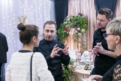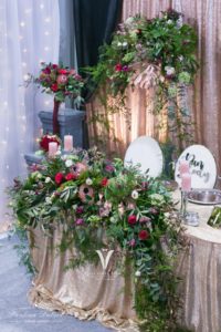 Pojawiły się cekiny w kolorze złotego różu oraz welurowe zasłony. Na krzesłach lustrzane napisy „Pan Młody” „Panna Młoda”. Pokazaliśmy je z przodu krzeseł, aby były widoczne dla wszystkich odwiedzających .